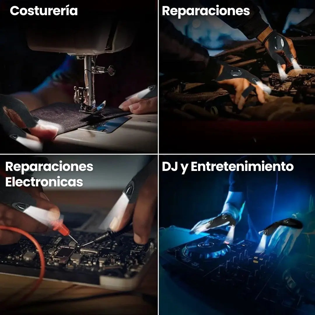- 🔦 Guantes LED: luz en dedo pulgar e índice para máxima precisión.